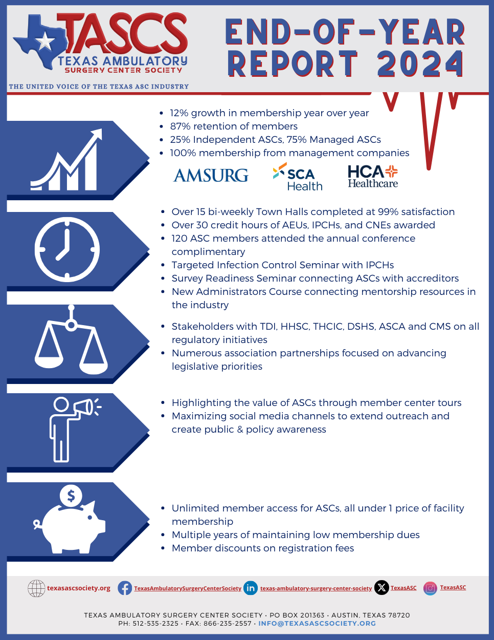 - Acts on behalf of Texas ASCs at the State Capitol and in Washington, D.C.